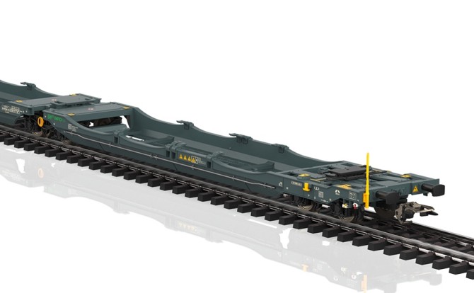Die beweglichen Klappriegel sind werkseitig montiert und können je nach Verwendung - wie beim Vorbild - verwendet werden. Für den Transport von Containern werden die Riegel einfach hochgeklappt und die Container in die Löcher gesteckt. Sollen LKW-Auflieger transportiert werden, müssen die seitlichen Klappriegel nach außen / unten geklappt werden. Einige Teile liegen dennoch bei, um zum Beispiel verschiedene Positionen des Stückbocks für die Auflieger nachstellen zu können oder eine weitere vorbildgerechte Zurüstung der Wagen für die Ausstellung in der Vitrine zu ermöglichen..