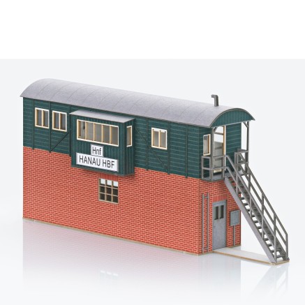 Dieser Bausatz aus lasergeschnittenem Architekturkarton bildet das bekannte Behelfsstellwerk "HANAU HBF Hnf" nach. Das Vorbild wurde nach dem Krieg als schnelle Behelfslösung aus einem Backsteinsockel mit einem aufgesetzten MCi Wagenkasten erstellt und blieb bis in die 1990er Jahre in Betrieb.