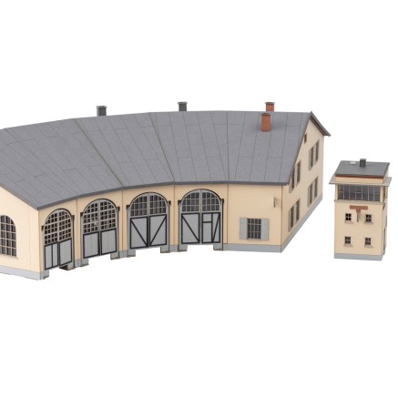 Der neue Rundlokschuppen ist dem in der fränkischen Stadt Selb nachempfunden. Der Bausatz aus Lasercut-Architekturkarton passt zur MINITRIX-Drehscheibe und hat einen Eingangswinkel der Tore von 15 Grad. Der Lokschuppen ist mit mehreren Bausätzen kombinier- und damit erweiterbar. Zusätzlich liegt ein Bausatz des Stellwerkes Selb bei.