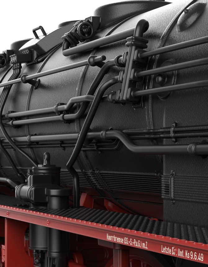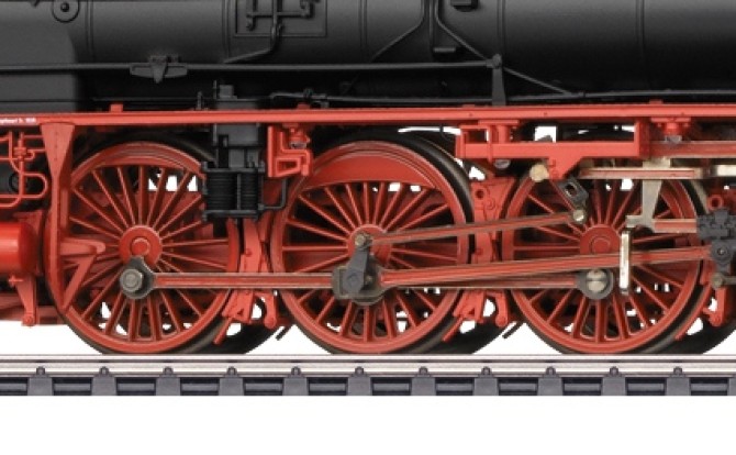 Das Modell dieser 01.10 wurde komplett neu konstruiert und mit modernsten Funktionen ausgestattet. Dabei ist die Detaillierung auf höchstem Niveau. Obwohl es bei Märklin/TRIX in der Vergangenheit bereits eine 01.10 (Neubaukessel) gab, handelt es sich um eine komplette neue Entwicklung, die neue Maßstäbe setzt. Ausgestattet ist das Modell mit einem digitalen Sounddecoder, der zahlreiche Soundfunktionen möglich macht. Des Weiteren besitzt das Modell einen Raucherzeuger mit geschwindigkeitsabhängigem, dynamischen (gepulstem) Rauch. Die schwere Metallausführung gewährleistet hervorragende Lauf- und Zugeigenschaften und eine hochwertige Detaillierung. Die digital schaltbare Triebwerksbeleuchtung schafft besondere Atmosphäre im Modell-BW. Natürlich kann auch die vorbildgerechte 2-Licht-Spitzenbeleuchtung wechselweise geschaltet werden und die flackernde Feuerbüchse rundet den Sound des Kohleschaufelns perfekt ab. Die großen Treibräder der Lok sind mit nur ca. 2 mm besonders flach ausgeführt und wirken extrem filigran. Alle Leitungen, Pumpen und Ventile sind separat angesetzt und bilden das Vorbild genau nach.