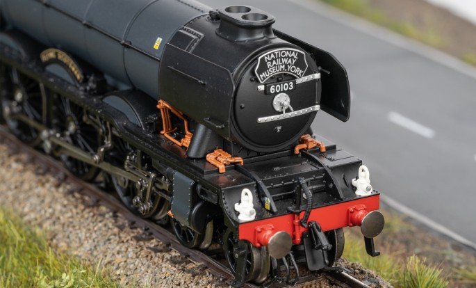 Die berühmteste Class A3 der britischen Eisenbahn ist zweifelsohne die Lok mit dem Namen "Flying Scotsman". Hier erscheint nun eine recht unbekannte aber dennoch höchst attraktive Farbvariante dieser berühmten Maschine. Diese schwarze Variante erzählt die Geschichte einer ganz speziellen Epoche.Während des zweiten Weltkrieges und auch noch danach erhielt die Maschine diese edle schwarz/graue Lackierung wie sie viele britische Lokomotiven während dieser Zeit trugen. Doch nicht nur während dieser Zeit, sondern auch bei der Generalüberholung ab 2006 wurde die Lokomotive in dieses Farbkleid getaucht. Der Grund war eher zweckmäßig, denn diese Lackierung war einfach anzubringen und nicht so aufwendig wie die grüne sehr detailreiche Farbgebung. Außerdem hat man die graue Farbe gewissermaßen als Schutzlackierung angesehen. In diesem Look konnte man die Maschine 2011 und 2012 bei britischen "Railfest" und währen der Olympischen Spiele erleben. 2016 waren alle Arbeiten abgeschlossen und die Lok wurde wieder in Grün lackiert.